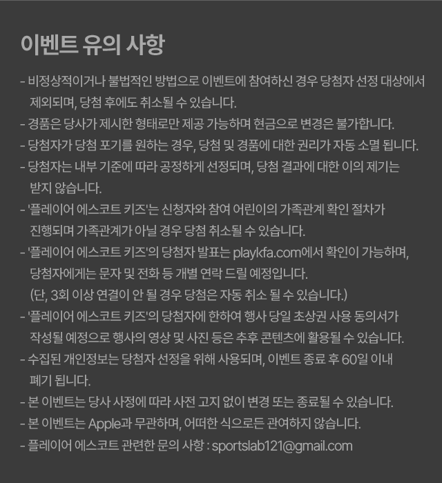 이벤트 유의 사항 - 비정상적이거나 불법적인 방법으로 이벤트에 참여하신 경우 당첨자 선정 대상에서 제외되며, 당첨 후에도 취소될 수 있습니다. - 경품은 당사가 제시한 형태로만 제공 가능하며 현금으로 변경은 불가합니다. - 당첨자가 당첨 포기를 원하는 경우, 당첨 및 경품에 대한 권리가 자동 소멸 됩니다. - 당첨자는 내부 기준에 따라 공정하게 선정되며, 당첨 결과에 대한 이의 제기는 받지 않습니다. - '플레이어 에스코트 키즈'는 신청자와 참여 어린이의 가족관계 확인 절차가 진행되며 가족관계가 아닐 경우 당첨 취소될 수 있습니다. - '플레이어 에스코트 키즈'의 당첨자 발표는 playkfa.com에서 확인이 가능하며, 당첨자에게는 문자 및 전화 등 개별 연락 드릴 예정입니다. (단, 3회 이상 연결이 안 될 경우 당첨은 자동 취소 될 수 있습니다.) - '플레이어 에스코트 키즈'의 당첨자에 한하여 행사 당일 초상권 사용 동의서가 작성될 예정으로 행사의 영상 및 사진 등은 추후 콘텐츠에 활용될 수 있습니다. - 수집된 개인정보는 당첨자 선정을 위해 사용되며, 이벤트 종료 후 60일 이내 폐기 됩니다. - 본 이벤트는 당사 사정에 따라 사전 고지 없이 변경 또는 종료될 수 있습니다. - 본 이벤트는 Apple과 무관하며, 어떠한 식으로든 관여하지 않습니다. - 플레이어 에스코트 관련한 문의 사항 : sportslab121@gmail.com