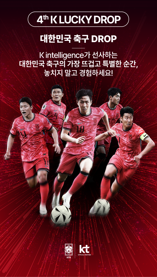 4th K LUCKY DROP. 대한민국 축구 DROP - K intelligence가 선사하는 대한민국 축구의 가장 뜨겁고 특별한 순간, 놓치지 말고 경험하세요! KFA | KT