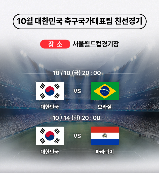 10월 대한민국 축구국가대표팀 친선경기 - 장소 : 서울월드컵경기장 (10월 10일(금) 20:00 대한민국 VS 브라질, 10월 14일(화) 20:00 대한민국 VS 파라과이).