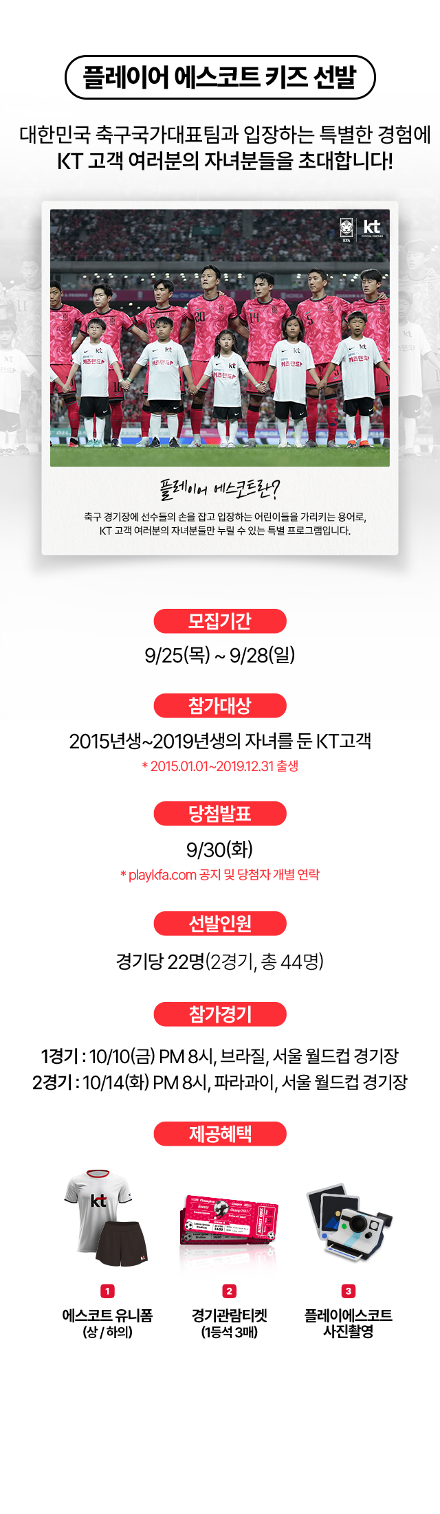 플레이어 에스코트 키즈 선발. 대한민국 축구국가대표팀과 입장하는 특별한 경험에 KT 고객 여러분의 자녀분들을 초대합니다! 플레이어 에스코트란? 축구 경기장에 선수들의 손을 잡고 입장하는 어린이들을 가리키는 용어로, KT 고객 여러분의 자녀분들만 누릴 수 있는 특별 프로그램입니다. 모집기간 : 9/25(목) ~ 9/28(일) / 참가대상 : 2015년생 ~ 2019년생의 자녀를 둔 KT고객 (2015.01.01 ~ 2019.12.31 출생) / 당첨발표 : 9/30(화) *playkfa.com 공지 및 당첨자 개별 연락 / 선발인원 : 각 경기당 22명(2경기, 총 44명) / 참가경기 : 1경기 - 10/10(금) PM 8시, 브라질, 서울 월드컵 경기장, 2경기 - 10/14(화) PM 8시, 파라과이, 서울 월드컵 경기장 / 플레이어 에스코트 제공 혜택 - 1. 에스코트 유니폼 상/하의, 2. 경기 관람 티켓 1등석 3매, 3. 플레이어 에스코트 사진 촬영